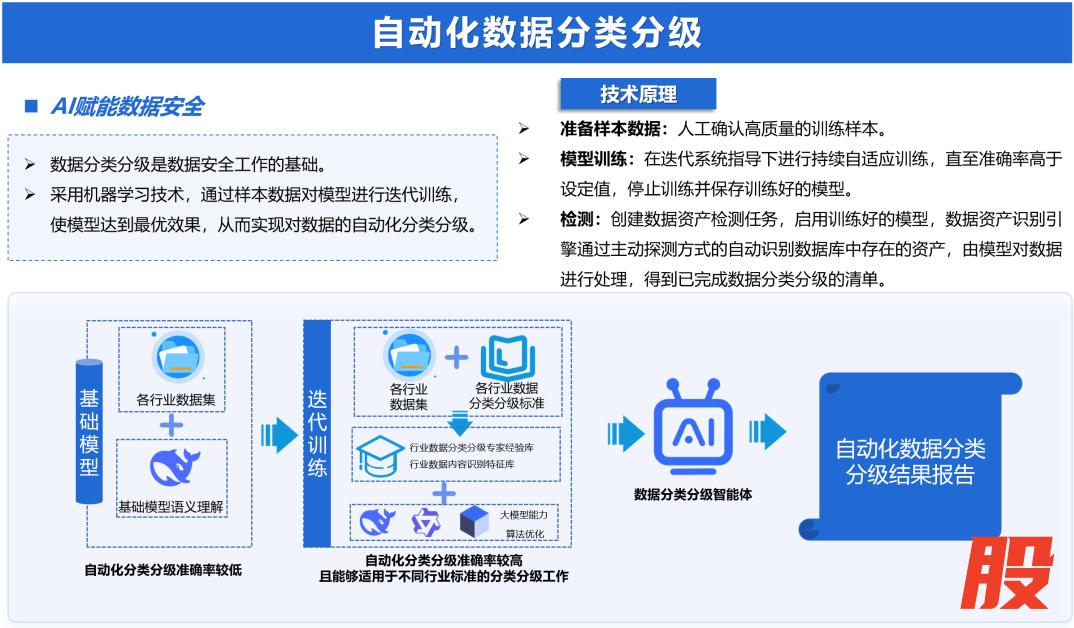 迪普科技AI数据分类分级智能体针对传统人工分类效率低、一致性差的问题,构建了集数据资产探测、AI模型引擎、模型管理与应用于一体的全流程解决方案。通过数据库协议解析与凭证认证,主动发现库表字段等对象并生成资产清单,研发了面向结构化与非结构化数据的智能分类分级技术。